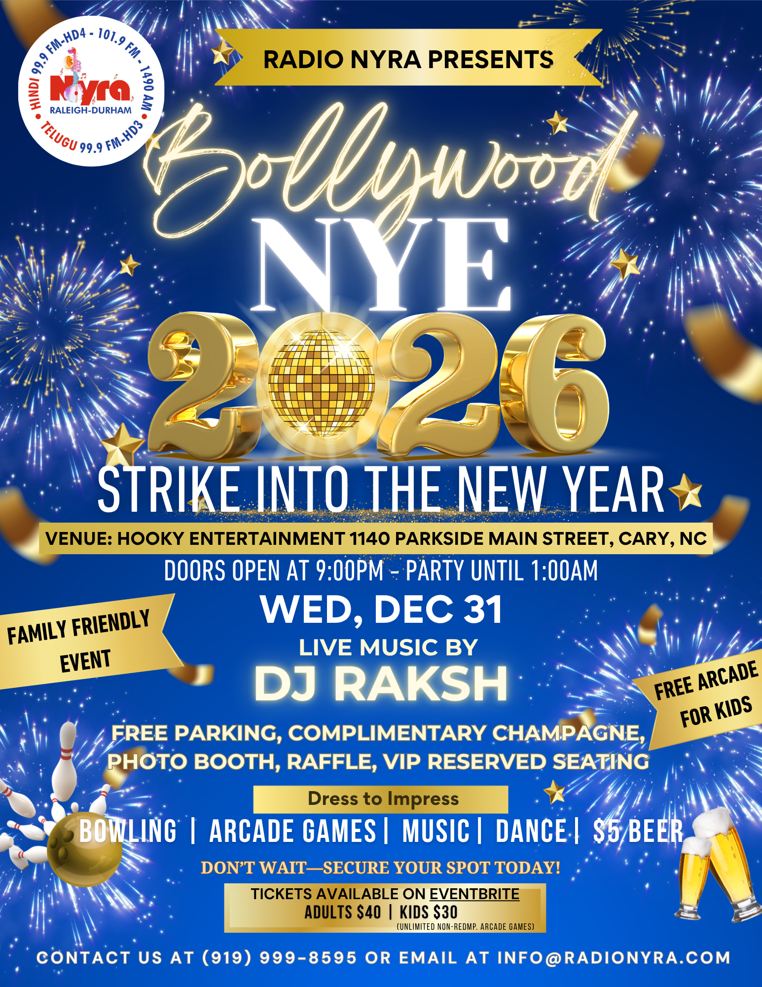 Radio Nyra Bollywood NYE 2026 – Strike Into the New Year takes over Hooky Entertainment with the Triangle’s most luxurious, family-friendly celebration! Enjoy a grand Bollywood night featuring live music by DJ Raksh, dazzling lights, and nonstop entertainment across the theater, bowling alley, and arcade. Capture the moment with professional photography, enjoy desi eats and $5 beers for the best bang for your buck.